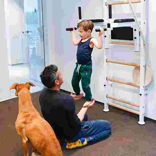 The BenchK “413” fitness wall bars enable children as well as adults to train in the comfort of their homes, their office or wherever else the workout station might be set up. Featuring a stunning white design and natural beechwood rungs, the wall bars will visually enhance any room. But the equipment doesn’t just look great, it’s also a fully fledged yet compact workout station for adults as well as an appealing adventure park for children.
