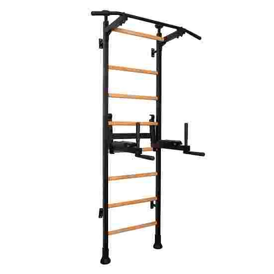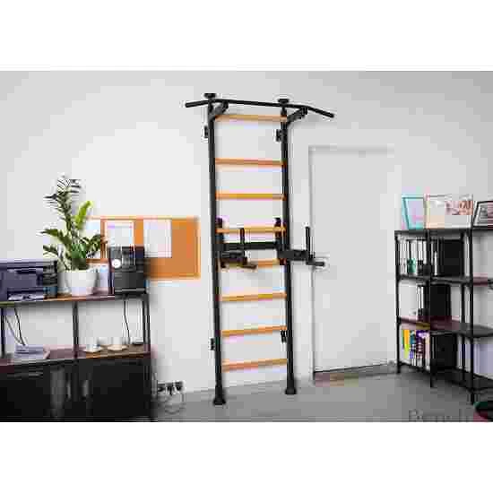 The BenchK “512” fitness wall bars feature 8 hand-oiled beech rungs, as well as a height-adjustable dip station with armrests and a barbell rest. The components have been laser-cut for a high-precision installation that not only looks great but also allows the user to work out in comfort. The metal parts exhibit a matt black powder-coated finish, providing the wall bars with a stylish look and making them a real eye-catcher. The equipment is great for a host of different exercises, allowing you to train your entire body. Whether used for pull-ups, barbell training, abdominal exercises or dips, these wall bars are a real everyday hero. Kids will also fully enjoy the equipment, particularly if you attach an optional extra to the pull-up bar, such as a gym ring or a climbing rope (must be ordered separately).