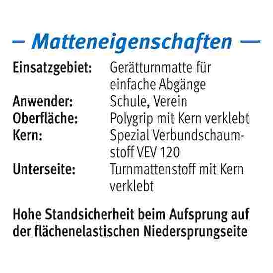 The “GTM 3000” apparatus gymnastics mat is ideally suited for use in schools and clubs. Its core, made from special composite foam guarantees excellent recoverability. The area-elastic core provides excellent stability on landing. In addition, the mat also has a cover made from tear-proof Polygrip gymnastics mat material and an underside made from textured gymnastics mat material. The mat’s angular construction means that several mats can be seamlessly placed together. Both sides are glued to the core, ensuring strength and durability. The gymnastics mats are available in different thicknesses and colours.